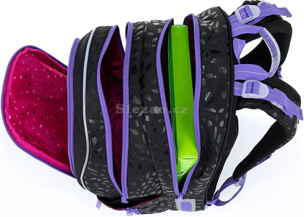 Dvoukomorový batoh CODA vyhovuje všem vyšším školačkám na prvním stupni ZŠ (doporučujeme od 125 cm). Svým objemem vydrží bez problémů až na druhý stupeň. I proto jsme jej navrhli v klidných tónech černé, oživené fialovými zipy a lesklými prvky.