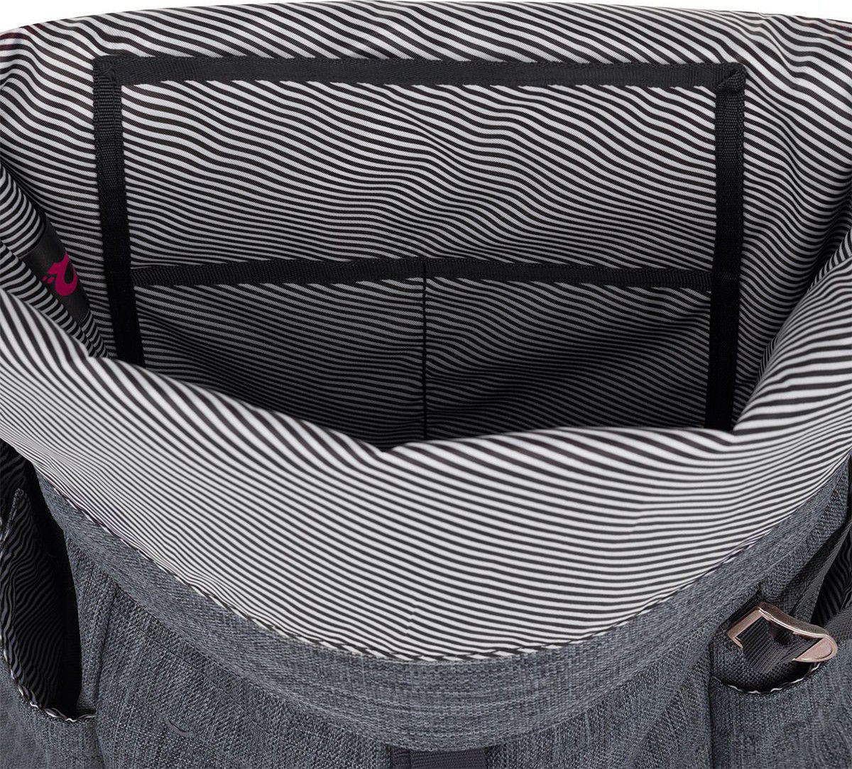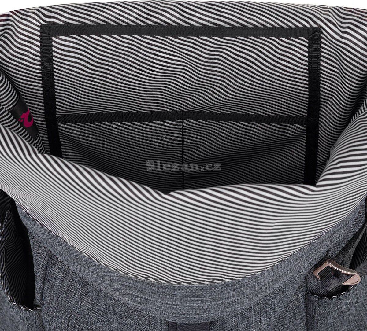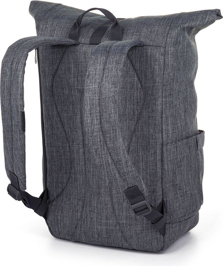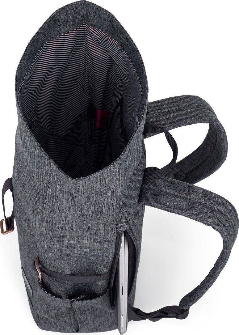 Objem batohu je variabilní díky rolltop systému zavírání s magnetem. Navíc si celý jeho obsah pojistíte kovovou sponou. Uvnitř velké komory je tříčlenná kapsa na drobnosti a malá kapsa na zip. Na zádech najdete polstrovanou kapsu na notebook či tablet. Boční kapsy z materiálu batohu udrží i 1,5 litrovou láhev na pití nebo deštník.