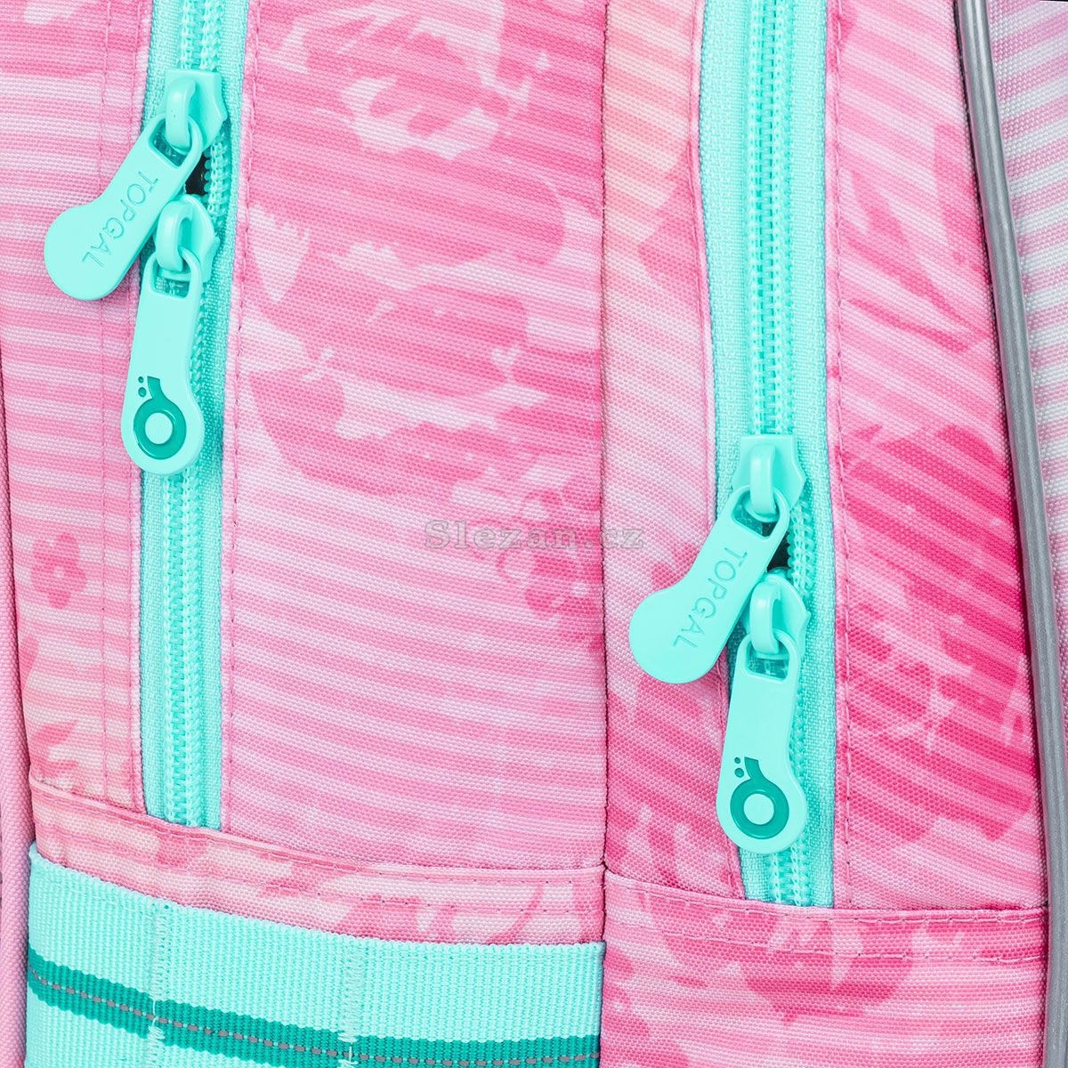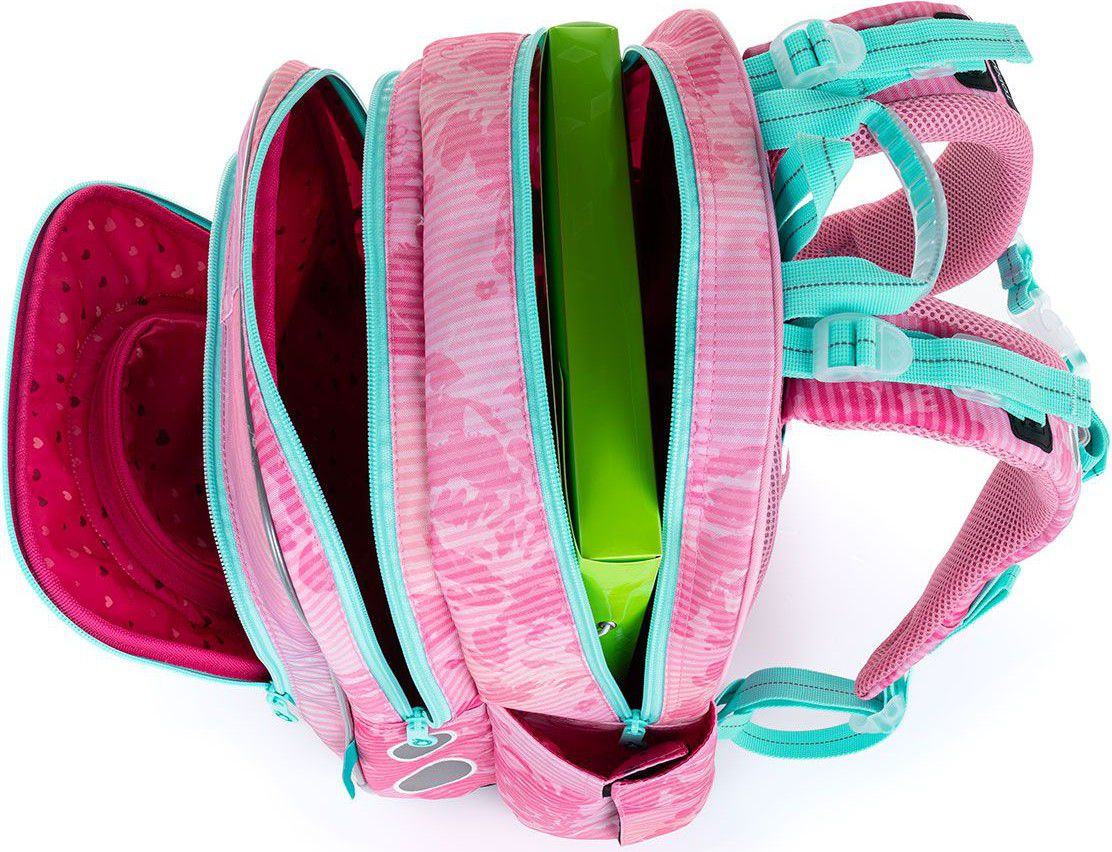 Batoh má dvě objemné hlavní komory. Zadní komora je širší - doporučujeme k zádům dávat nejtěžší učebnice nebo desky na sešity. Přední komora je o něco užší a je v ní umístěna ještě malá síťová kapsa na zip a jmenovka.