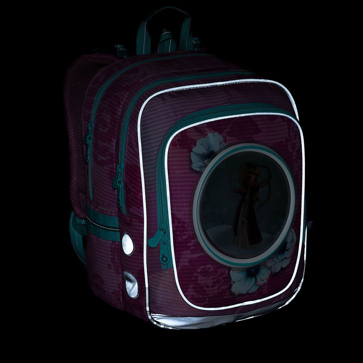 Posviťte si na batoh ve tmě a uvidíte, kolika reflexními prvky je opatřen. Dalece překračuje doporučené množství reflexních prvků, proto vaše dítě nikdo ve tmě nepřehlédne.