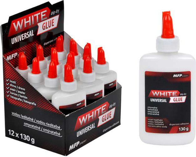 Disperzní bílé lepidlo na papír, karton, textil, fotografie, dřevo, kůži, koženku a korek.