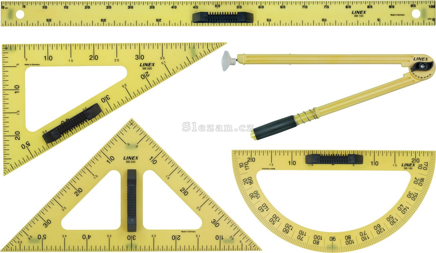 Sada obsahuje: pravítko 100 cm, 2x trojúhelník 45/90° a 30/60°, úhloměr, kružítko 45 cm.