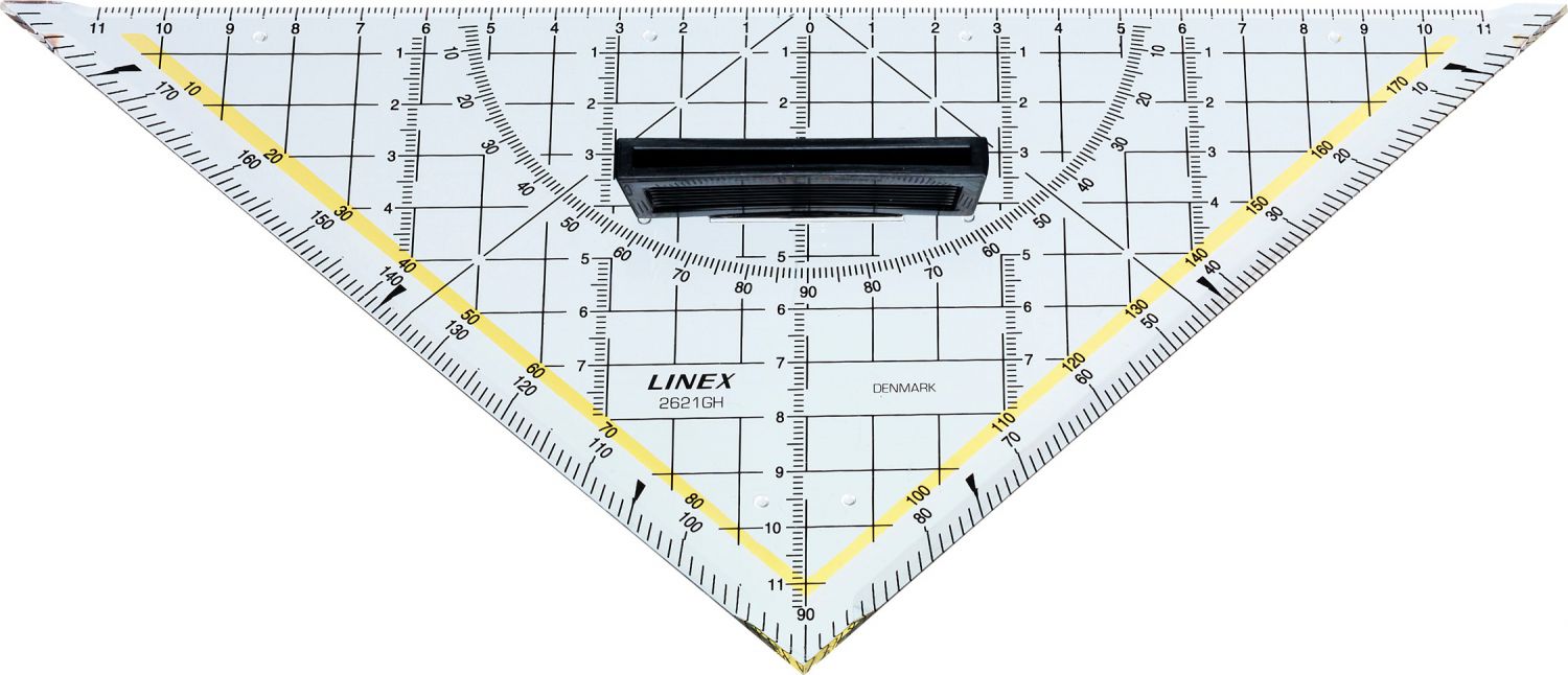 Multifunkční trojúhelník kombinuje pravítko, rýsovací trojúhelník a úhloměr v jednom.