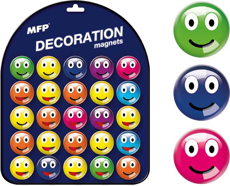 Skleněný, dekorační, kulatý magnet v různých motivech smajlíků, na magnetické tabulce je 25 různých designů.