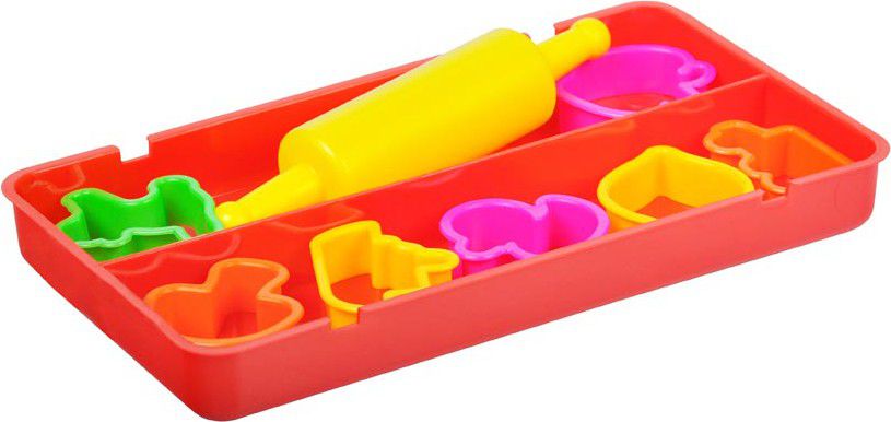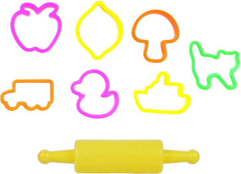 Sada obsahuje: - 7 barev modelovací hmoty (růžová, oranžová, žlutá, červená, zelená, modrá, fialová) - 7 barevných tvořítek různých tvarů - 1 váleček Varování:
