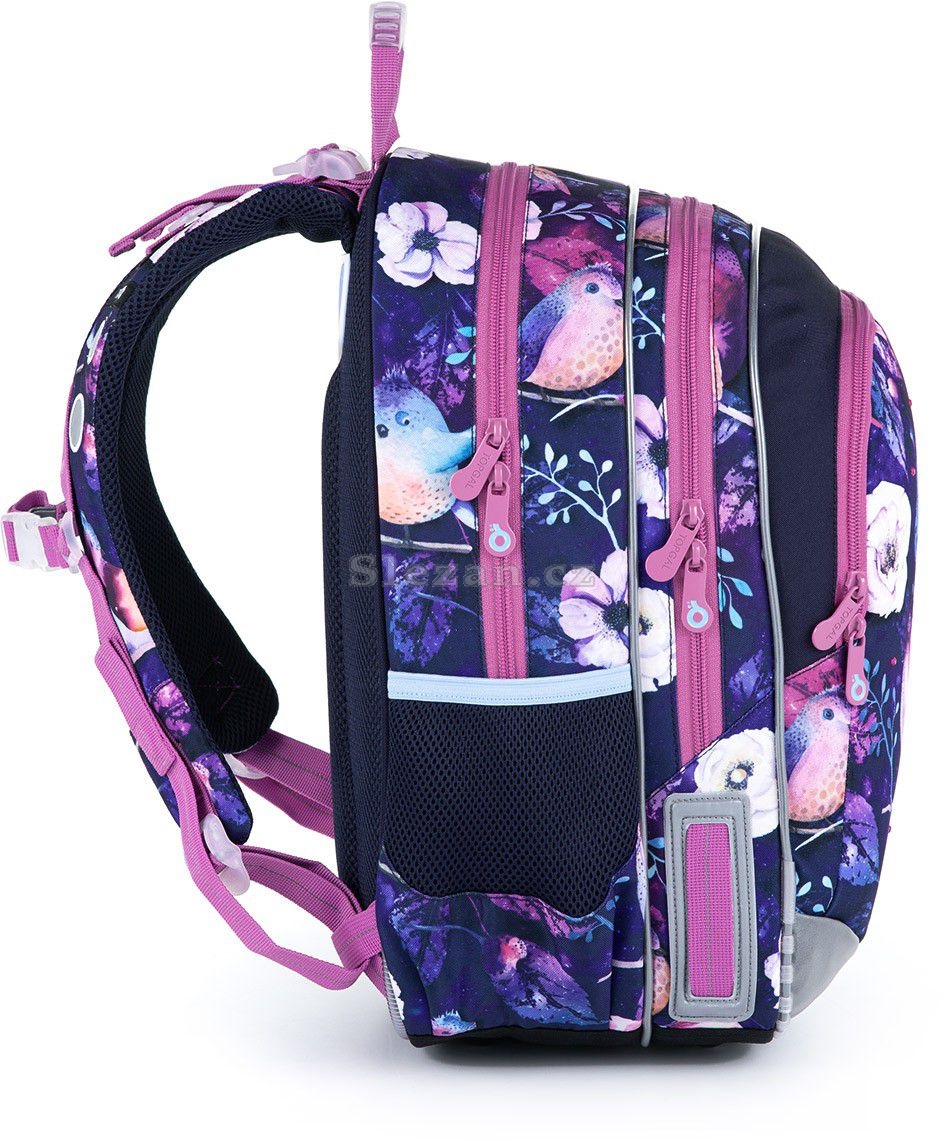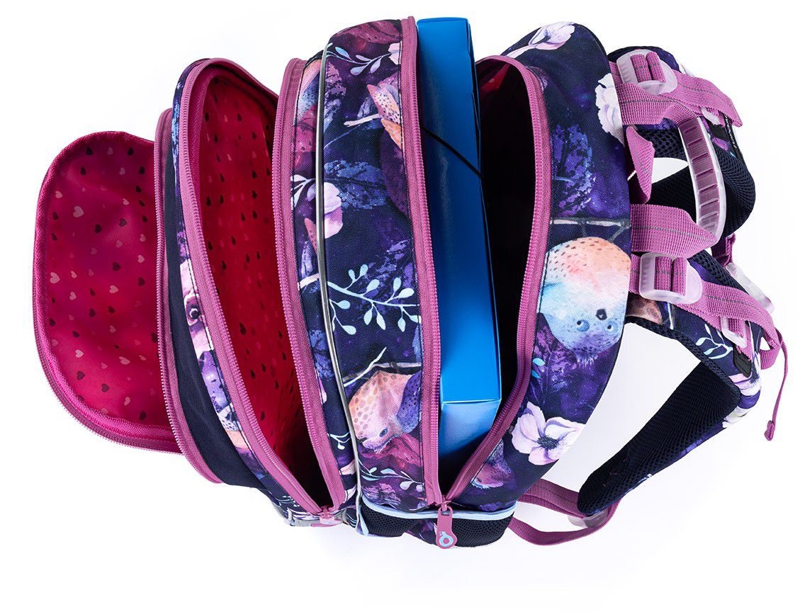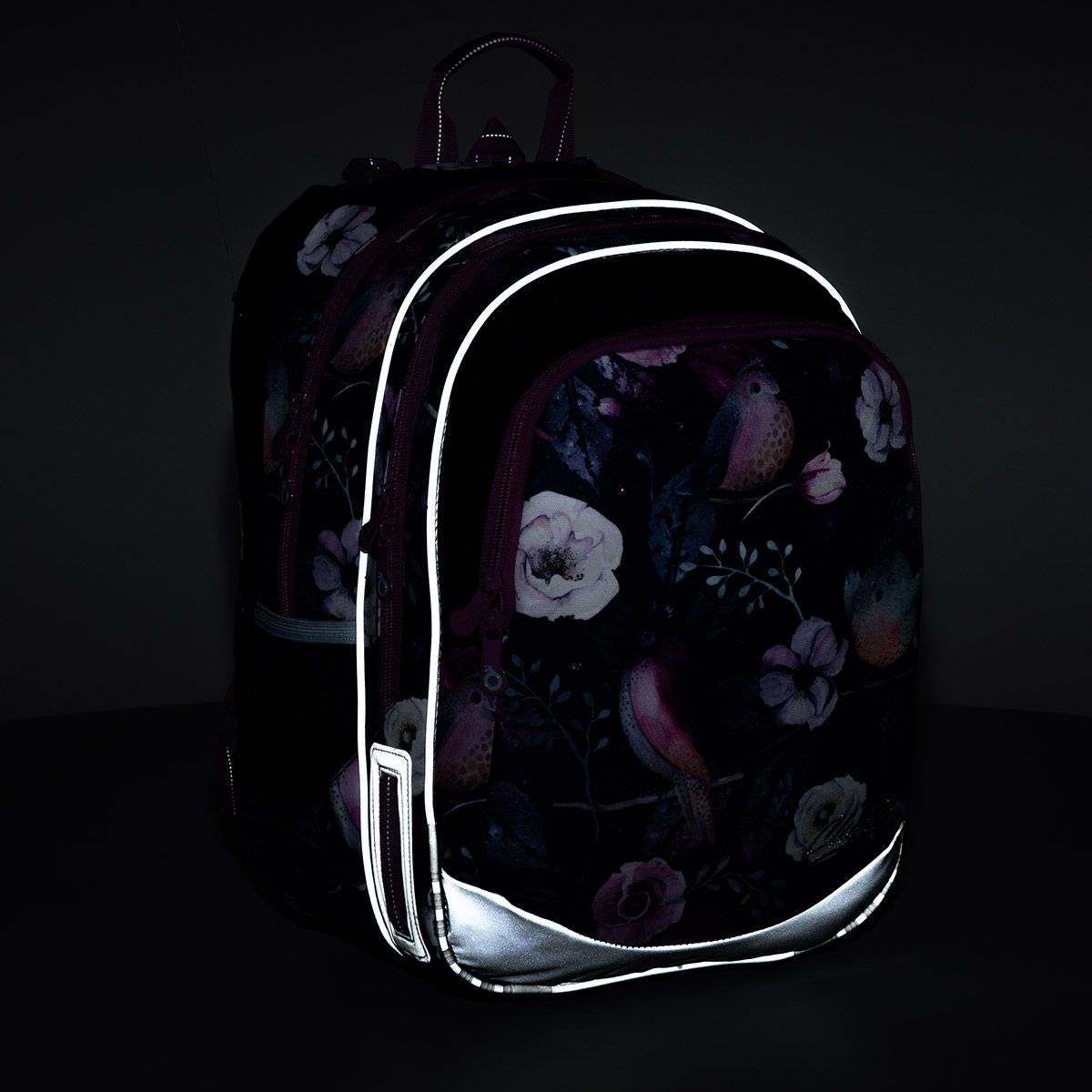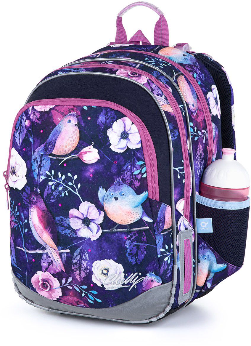 Hlavní charakteristika: lehký, ale objemný batoh do 1. – 4. třídy pevná lisovaná záda doporučujeme od 120 cm výšky Lehoučký dvoukomorový batoh pro dívky na prvním stupni s motivem ptáčků, kytiček a s fialovými třpytkami. To je parádní kombinace pro školačky na prvním stupni ZŠ. Navíc neváží ani kilogram a pojme spoustu nákladu! Batoh je lehký hlavně díky lisovaným tvarovaným zádům. Ramenní popruhy jsou měkce polstrované, ergonomicky tvarované a nastavitelné v jejich spodní i horní části. Hrudní popruh zajistí, že popruhy nebudou padat z ramen. Zadní komora batohu ELLY je velmi objemná, dejte do ní nejtěžší učebnice a atlasy. Přední komora je užší a je doplněna o malou síťovou kapsu na zip a jmenovku. Objemná je rovněž přední hluboká kapsa, kterou můžete použít buď na přenášení pouzdra PENN 21004 ve stejném designu, nebo do ní dejte třeba krabičku ZOLA se svačinkou. V kapse je odnímatelná karabina na klíče, takže se vám v batohu mezi potřebnostmi nezatoulají. Po obou stranách batohu najdete síťové kapsičky na přenášení lahviček s pitím. Batoh je doplněn reflexními prvky po všech stranách batohu i na ramenních popruzích. Další vychytávky: ucho s plastovou rukojetí pro přenášení aktovky v ruce poutko k zavěšení batůžku na háček u lavice zátěr proti dešti - látka nepromokne odolné dno batohu z pevného materiálu TOPDURA s plastovými nožkami batoh byl testován v ITC Zlín, kde prošel na jedničku Náš tip: Batoh má kapsičky na lahvičky na pití po obou stranách batohu. Pokud do jedné dáte plnou lahvičku s pitím, snažte se do druhé umístit předmět podobné váhy, aby byl batoh správně vyvážen.