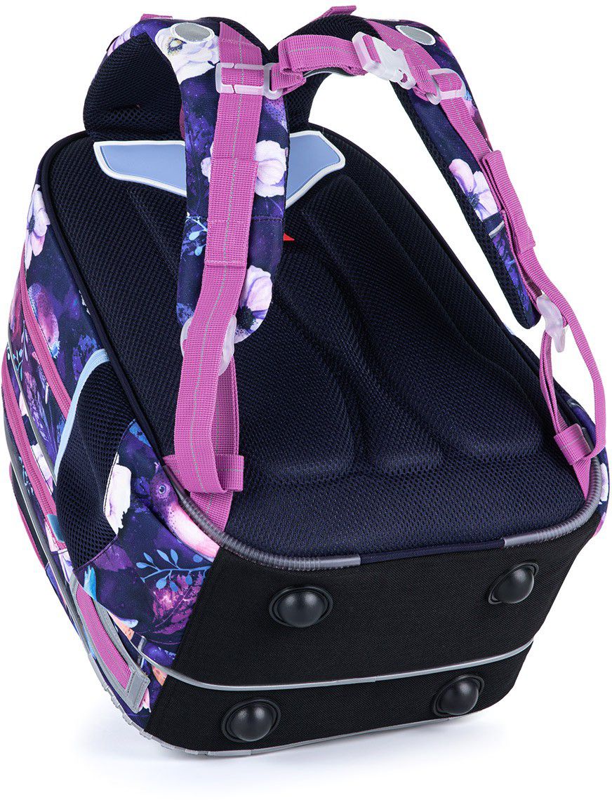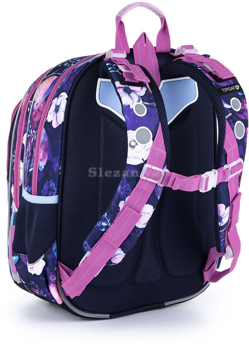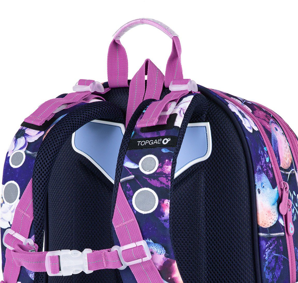 Hlavní charakteristika: lehký, ale objemný batoh do 1. – 4. třídy pevná lisovaná záda doporučujeme od 120 cm výšky Lehoučký dvoukomorový batoh pro dívky na prvním stupni s motivem ptáčků, kytiček a s fialovými třpytkami. To je parádní kombinace pro školačky na prvním stupni ZŠ. Navíc neváží ani kilogram a pojme spoustu nákladu! Batoh je lehký hlavně díky lisovaným tvarovaným zádům. Ramenní popruhy jsou měkce polstrované, ergonomicky tvarované a nastavitelné v jejich spodní i horní části. Hrudní popruh zajistí, že popruhy nebudou padat z ramen. Zadní komora batohu ELLY je velmi objemná, dejte do ní nejtěžší učebnice a atlasy. Přední komora je užší a je doplněna o malou síťovou kapsu na zip a jmenovku. Objemná je rovněž přední hluboká kapsa, kterou můžete použít buď na přenášení pouzdra PENN 21004 ve stejném designu, nebo do ní dejte třeba krabičku ZOLA se svačinkou. V kapse je odnímatelná karabina na klíče, takže se vám v batohu mezi potřebnostmi nezatoulají. Po obou stranách batohu najdete síťové kapsičky na přenášení lahviček s pitím. Batoh je doplněn reflexními prvky po všech stranách batohu i na ramenních popruzích. Další vychytávky: ucho s plastovou rukojetí pro přenášení aktovky v ruce poutko k zavěšení batůžku na háček u lavice zátěr proti dešti - látka nepromokne odolné dno batohu z pevného materiálu TOPDURA s plastovými nožkami batoh byl testován v ITC Zlín, kde prošel na jedničku Náš tip: Batoh má kapsičky na lahvičky na pití po obou stranách batohu. Pokud do jedné dáte plnou lahvičku s pitím, snažte se do druhé umístit předmět podobné váhy, aby byl batoh správně vyvážen.