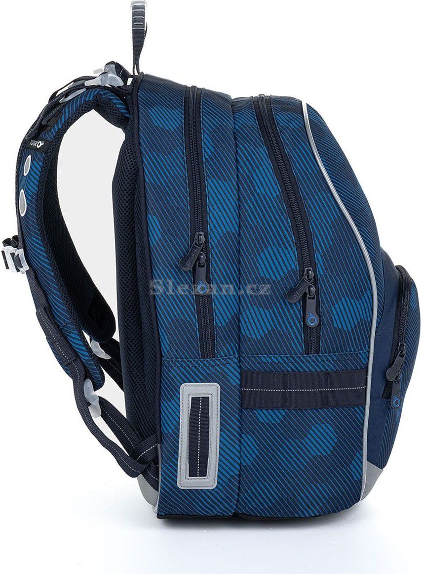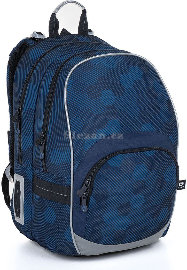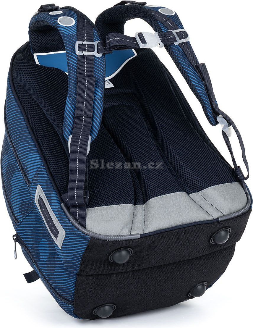 Dvoukomorový model KIMI měří na výšku 43 cm, proto svým objemem skvěle poslouží minimálně do páté třídy. Kluci mají modrou barvu rádi, ale jak je u nás zvykem, nechtěli jsme obyčejný batoh. Proto jsme batoh oživili drobnými šestiúhelníky.
