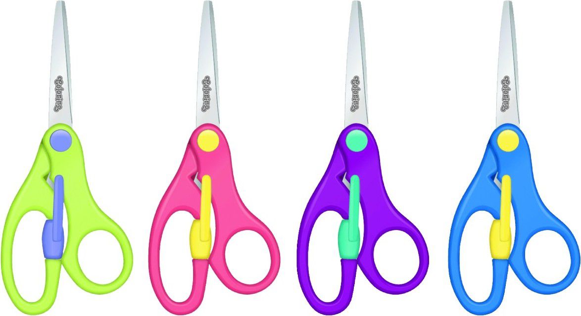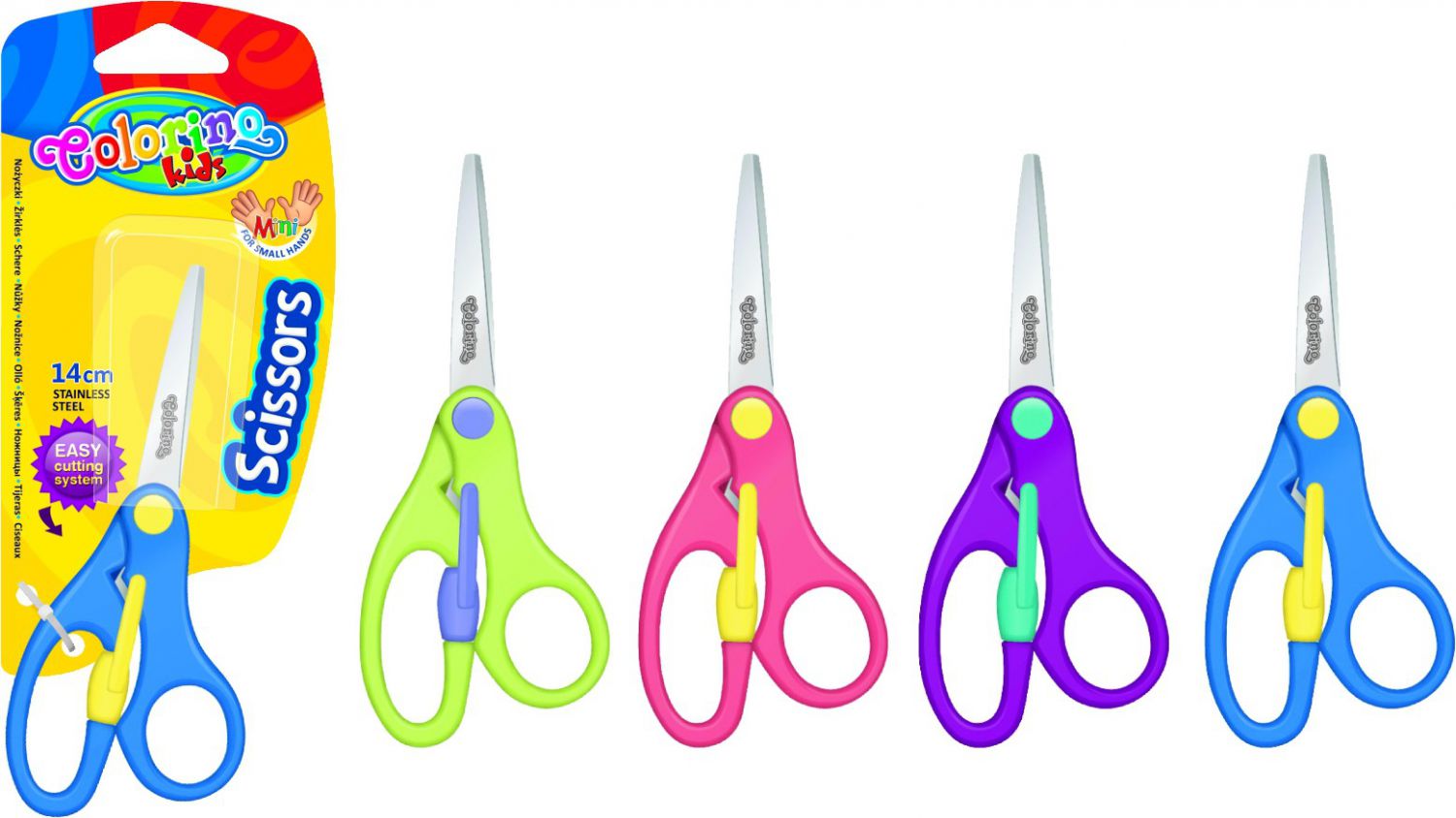 Dětské nůžky s pomocnou plastovou pojistkou, která usnadňuje stříhání a chrání prsty dítěte proti poranění.