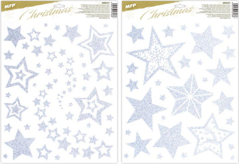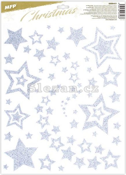 Vánoční okenní fólie s motivem stříbrných hvězd s glitry.