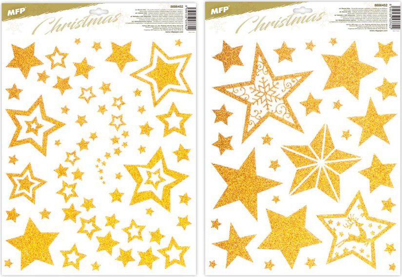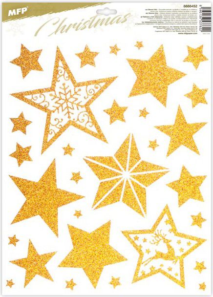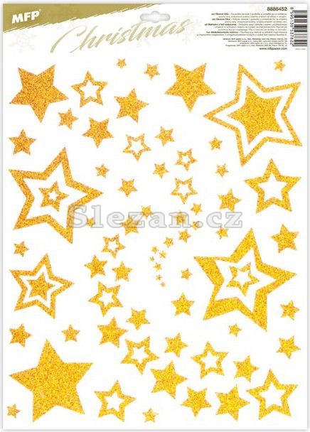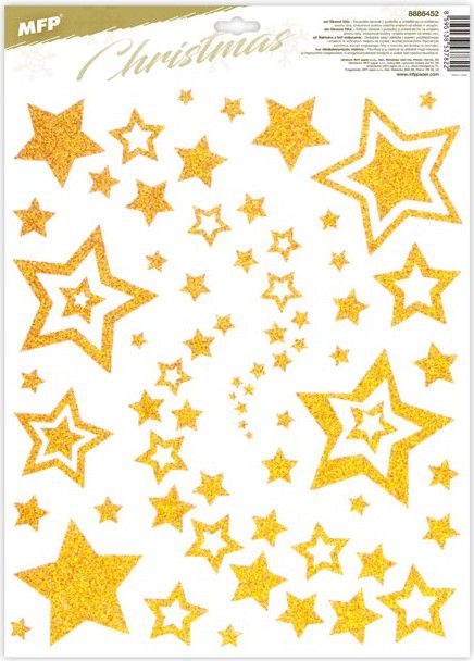 Vánoční okenní fólie s motivem zlatých hvězd s glitry.