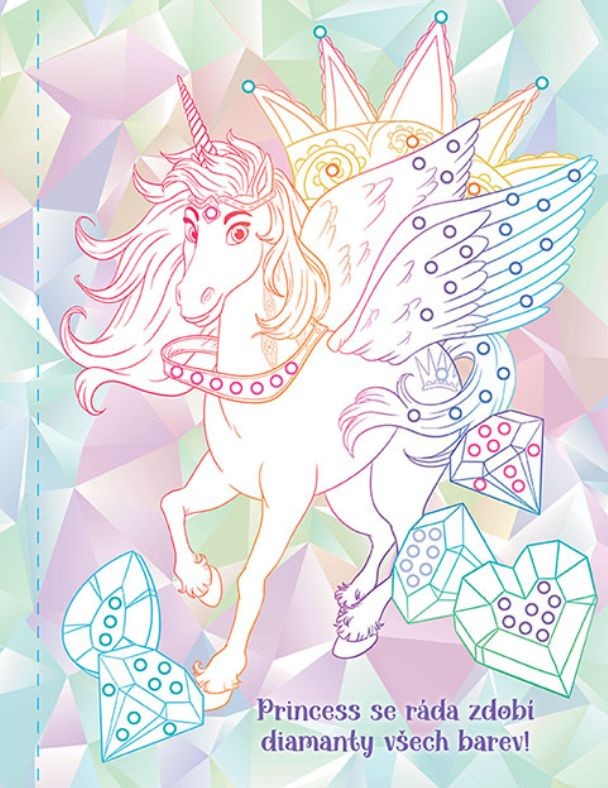 Omalovánky obsahují 12 stran s omalovánkami a jeden list třpytivých kamínků k ozdobení obrázků.