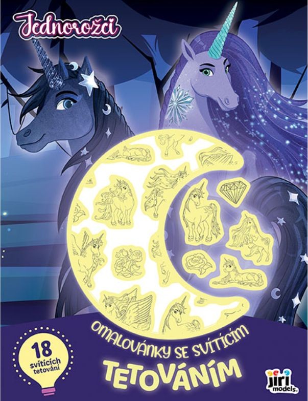 Omalovánky obsahují 16 barevných stran s obrázky k vybarvení a list originálních tetovaček, které ve tmě svítí.