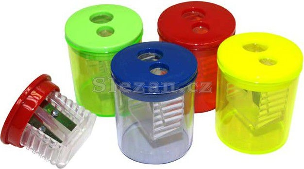 Plastové kulaté školní ořezávátko/strouhátko na 2 tužky se zásobníkem na odpad - ořezávátko patří do nezbytné výbavy každého školáka! Břit je připevněný šroubkem, takže jde demontovat a nabrousit. Uvedená cena je za 1 ks. Dodáváme ve 4 barvách - modrá, oranžová, červená, zelená. Všech 12 ks dodáváme v plastové krabičce.