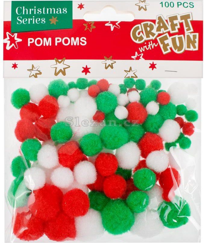 Opakowanie zawiera pompony o róznych rozmiarach w trzech kolorach: czerwony, zielony, biały.