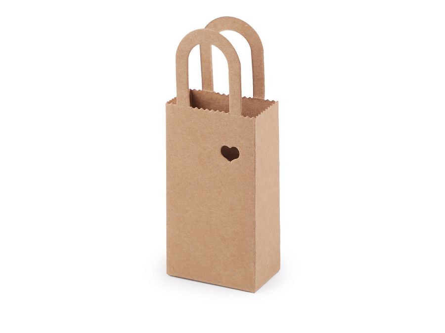 Papírová krabička ve tvaru taštičky má na přední straně malý výřez ve tvaru srdíčka. Využijete ji na zabalení drobných dárků. Pokud jste kreativní, můžete krabičku dozdobit.