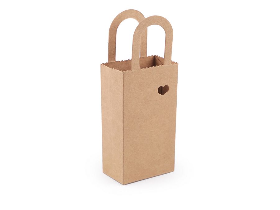 Papírová krabička ve tvaru taštičky má na přední straně malý výřez ve tvaru srdíčka. Využijete ji na zabalení drobných dárků. Pokud jste kreativní, můžete krabičku dozdobit.