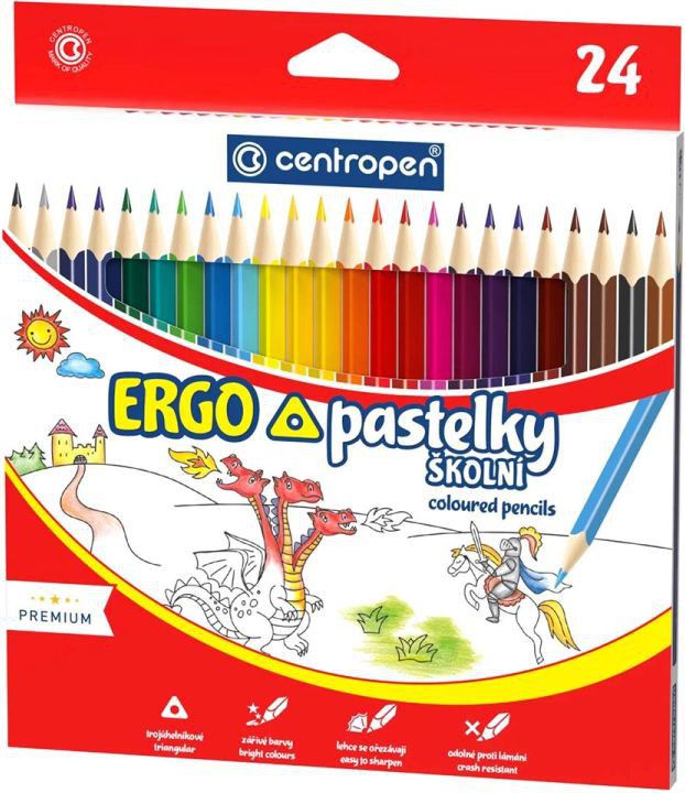 Sada školních trojhranných pastelek v 24 barevných odstínech.