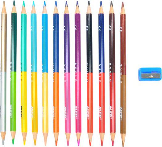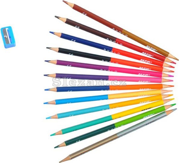 Set pastelek obsahuje: - 12 ks oboustranných pastelek, tedy 24 barev celkem ( 3x odstíny zelené, 3x odstíny hnědé, 3x odstíny oranžové, 2x odstíny červené, 2x odstíny žluté, 3x odstíny modré, zlatá, stříbrná, černá, růžová, 3x odstíny fialové) - 1x ořezávátko