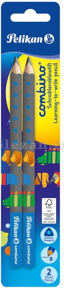 trojhranná modrá silná Pelikan Combino, ergonomická, lesní certifikace FSC, tělo s modrými prvky a zvířátky, se jmenovkou, na blistru