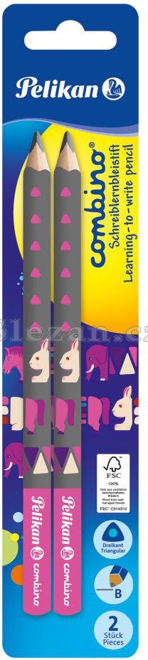 trojhranná růžová silná Pelikan Combino, ergonomická, certifikace FSC, tělo s růžovými prvky a zvířátky, se jmenovkou, na blistru