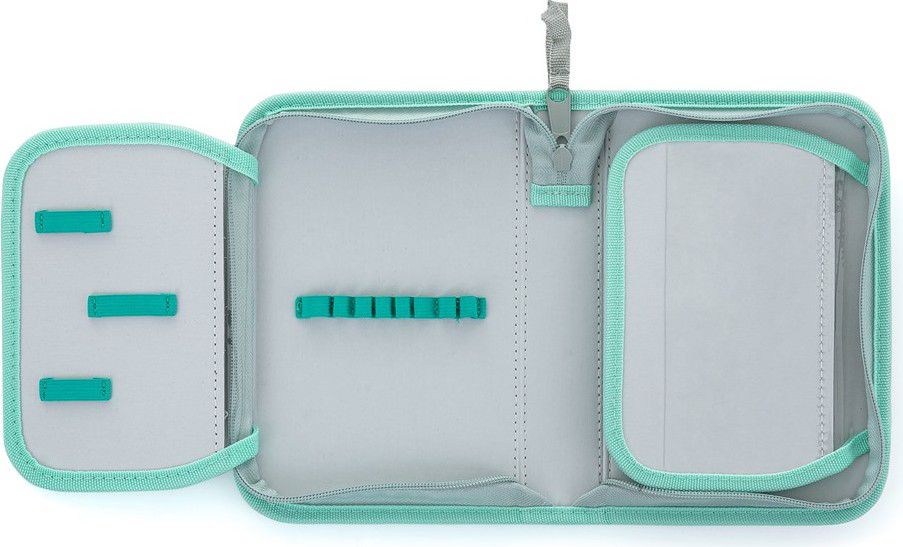 Prázdný, obsahuje 25 gumových poutek pro uchycení psacích potřeb.
