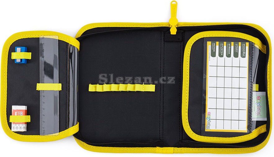 Na vnitřních chlopních jsou průhledné fólie pro rozvrh hodin.