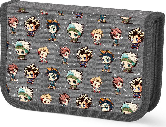 Školní jednopatrový nevybavený penál se dvěma chlopněmi v tmavě šedé barvě s motivem anime maskotů.