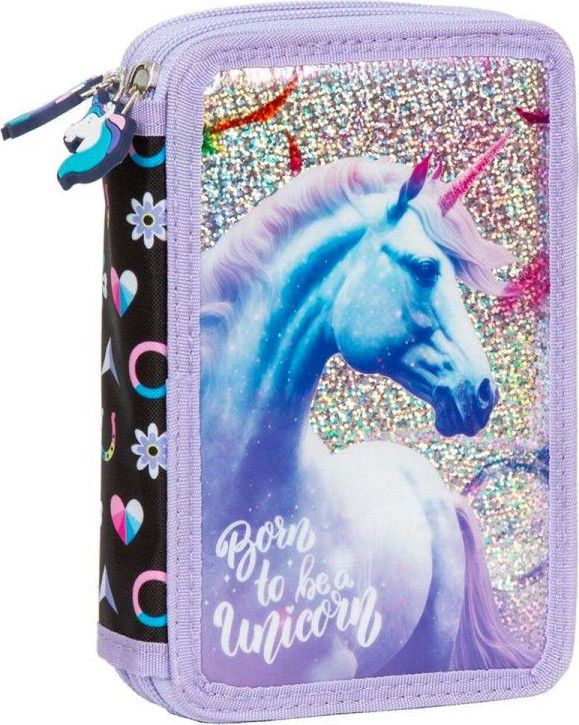 Plně vybavený dvoupatrový penál a pružnými úchyty pro školní potřeby, uzavíratelný silným zipem.