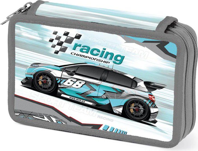 Školní dvoupatrový nevybavený penál s obrázkem závodního auta.