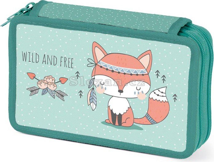 Školní dvoupatrový nevybavený penál ve světle zelené barvě s motivem lišky.