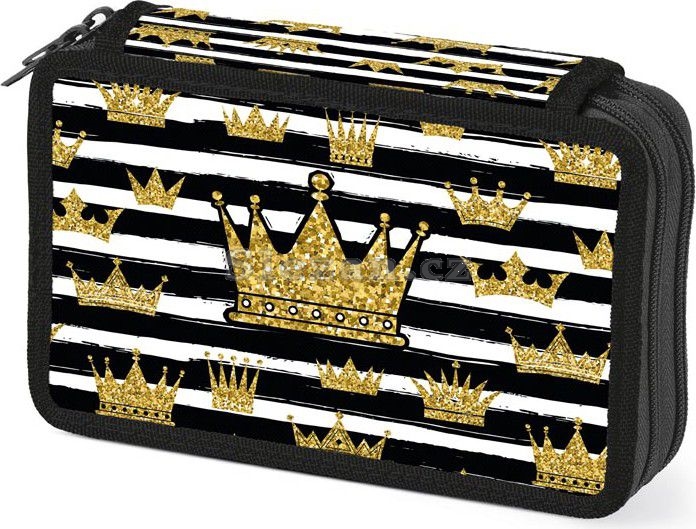 Školní dvoupatrové pouzdro se dvěma chlopněmi s obrázkem zlaté korunky.