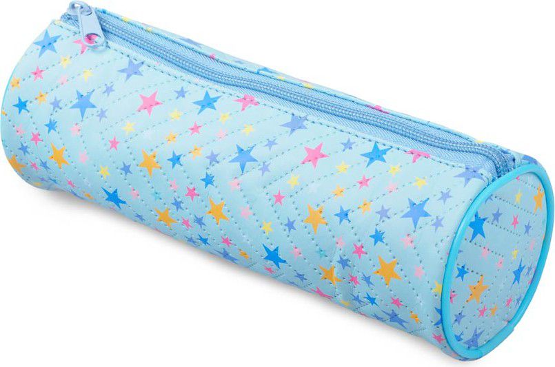 Školní penál/etue válcového tvaru ve světle modré barvě s barevnými hvězdičkami.