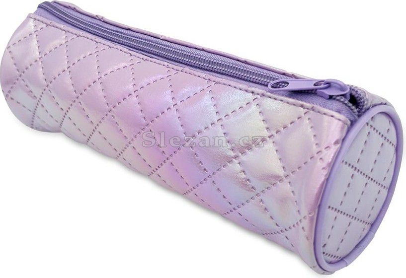 Školní penál/etue válcového tvaru v jemné fialové barvě.