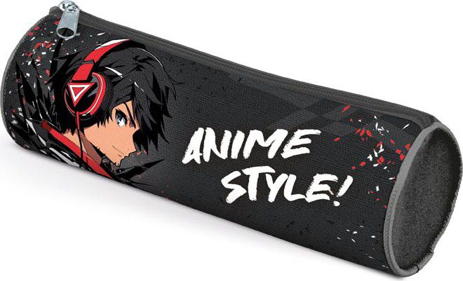 Školní penál/etue válcového tvaru je převážně černé barvy s motivem anime postavy a bílým nápisem ANIME STYLE! .