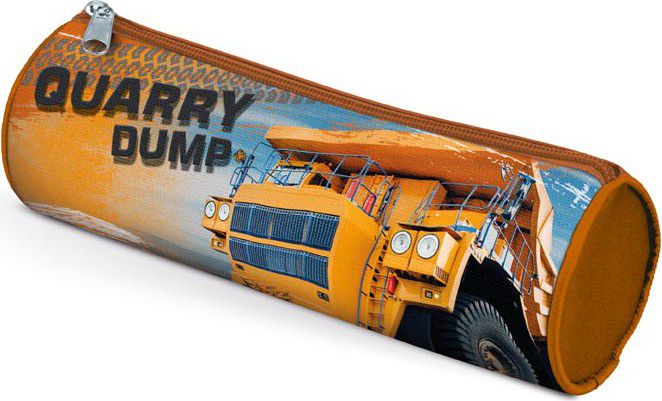 Školní penál/etue válcového tvaru má nápadný design s motivem velkého stavebního nákladního vozu.