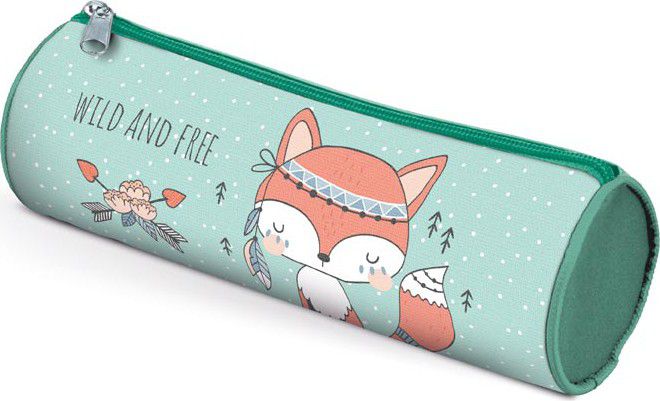 Školní penál/etue ve světle zelené barvě s motivem lišky.