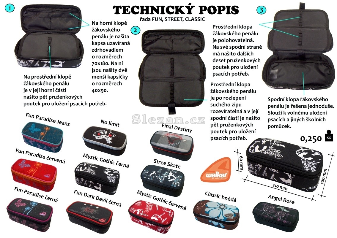 Kvalitní žákovský penál. Na horní klopě je našita kapsa uzavíraná zdrhovadlem. Na ní jsou pak našity další dvě malé kapsičky. Prostřední klopa je po rozlepení suchého zipu rozevíratelná. Na její horní i spodní straně je našito deset pruženkových poutek pro uložení psacích potřeb. Jako hlavní materiál je použit Polyester 600D 72T s vodoodpudivou úpravou a při celkových rozměrech v.60 x h.100 x d.210 mm váží penál pouhých 0,250 kg