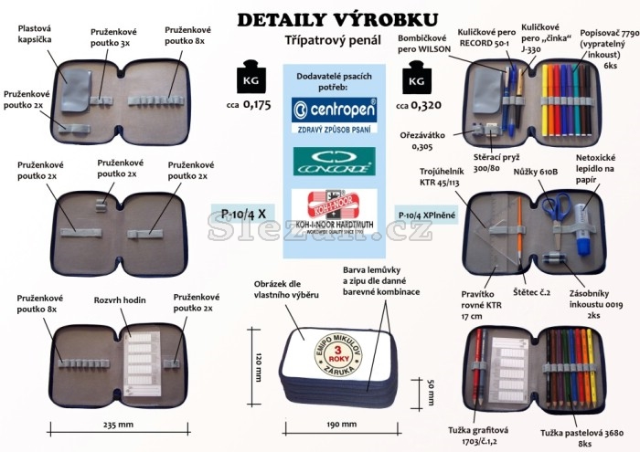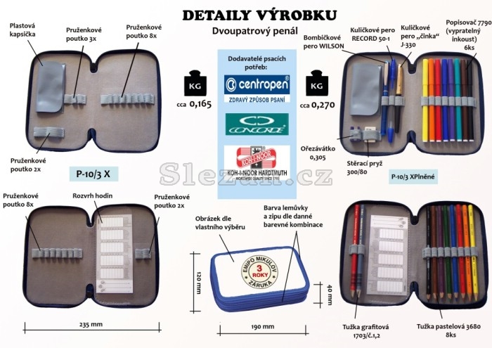 Pouzdro má rozměr š.190 x v.55 x h.120mm. Prázdné váží 0,19kg (plněné 0,38kg). Můžete si vybrat mezi penálem neplněným nebo plněným psacími potřebami.