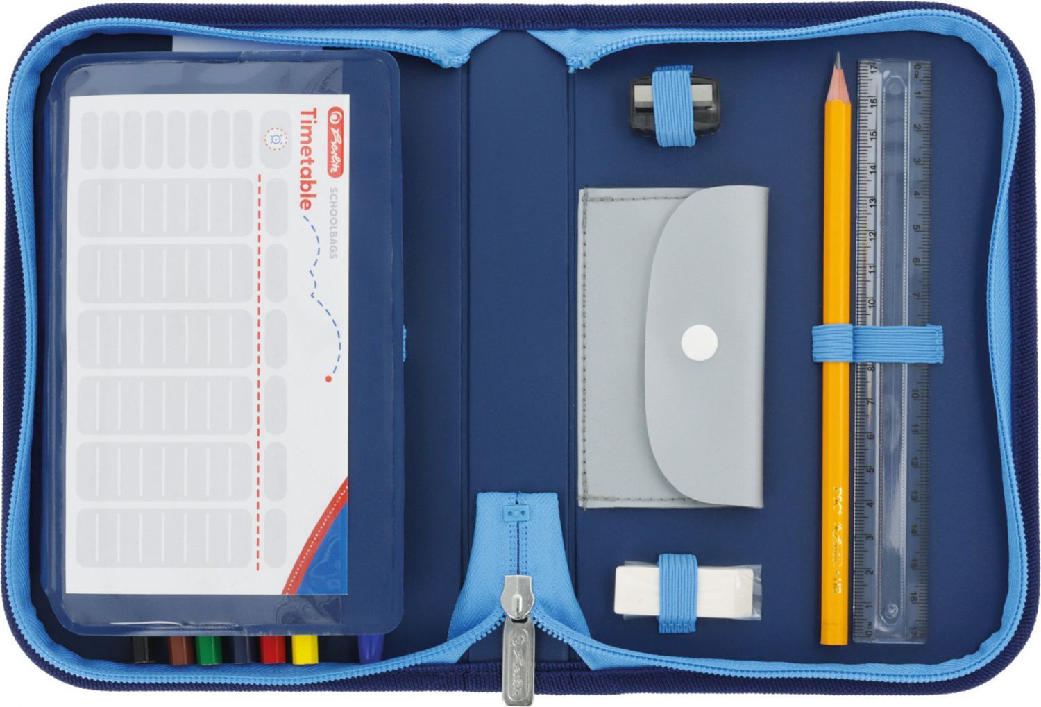 19 ks psacích potřeb dílů ľ 6 fixí, 6 pastelek, 1 tužka, 1 pero, 1 ořezávátko, 1 guma, 1 pravítko,
