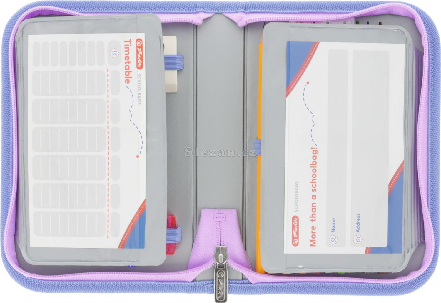 31 dílů - 14 fixů, 8 šestihranných pastelek, 2 tužky, ořezávátko, guma, 16 cm pravítko, trojúhelník, kuličkové pero, rozvrh hodin, vizitka,