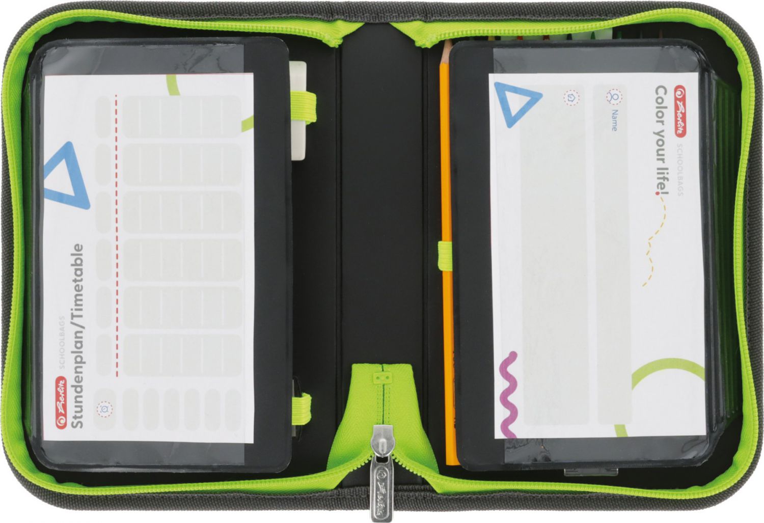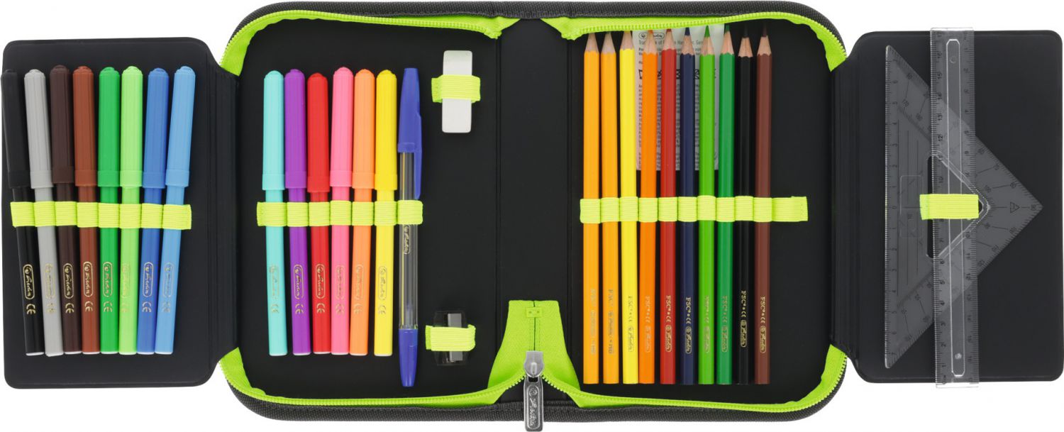 31 dílů - 14 fixů, 8 šestihranných pastelek, 2 tužky, ořezávátko, guma, 16 cm pravítko, trojúhelník, kuličkové pero, rozvrh hodin, vizitka,