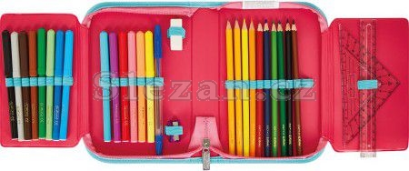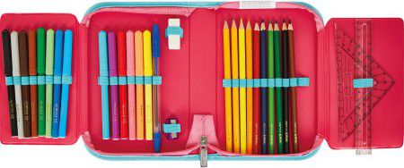 náplň: 14 fixů, 8 šestihranných pastelek, 2 tužky šestihranné, 1 plastové ořezávátko, 1 guma, 1 plastové pravítko 16 cm, 1 trojúhelníková geometrie, 1 kuličkové pero, 1 rozvrh, 1 vizitka