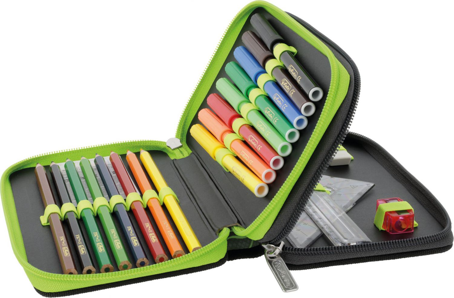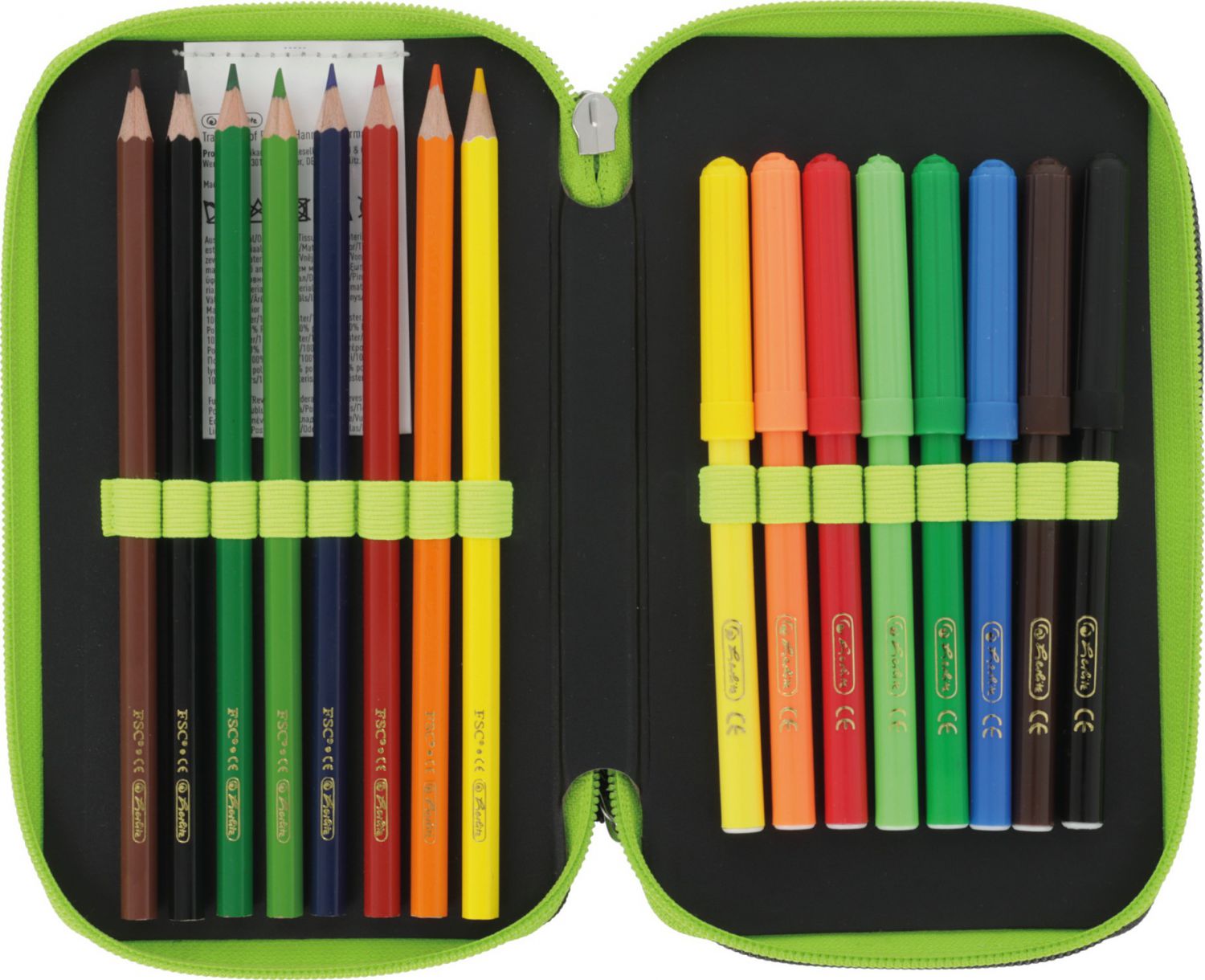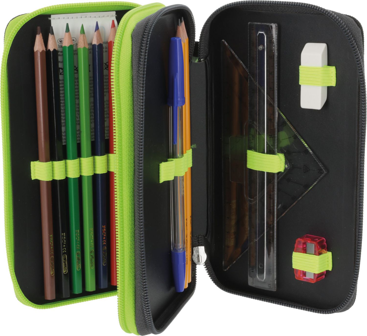 23 dílů - 8 fixů, 8 pastelek, 2 tužky, ořezávátko, guma, kuličkové pero, 16 cm pravítko, trojúhelník,
