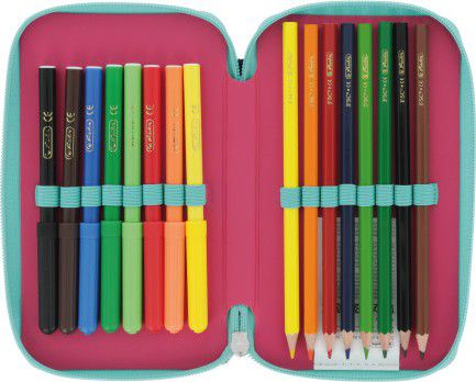 8 fixů, 8 pastelek, 2 tužky, ořezávátko, guma, kuličkové pero, 16 cm pravítko, trojúhelník,
