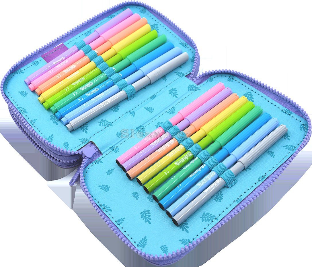 Dvoupatrový penál s motivem Stitche. Odolný zip je sladěný s kontrastním s lemováním. Pevné ploché gumičky na psací potřeby drží tvar a nevytahávají se. Vybavení v pastelových barvách perfektně ladí s celým penálem.