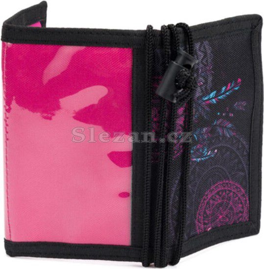 Peněženka se zavře suchým zipem a zavěsí na krk látkovou šňůrkou.