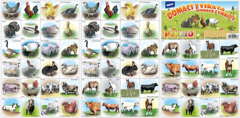 Výborná učební pomůcka pro děti a rodiče. Naučte své děti poznávat zvířata a procvičujte jejich paměť. Tato hra je zabaví na dlouhé hodiny. Pexeso se skládá ze tří A4, na kterých najdete 64 kartiček domácích zvířat a návod ke hře - na kartičkách jsou názvy zvířat