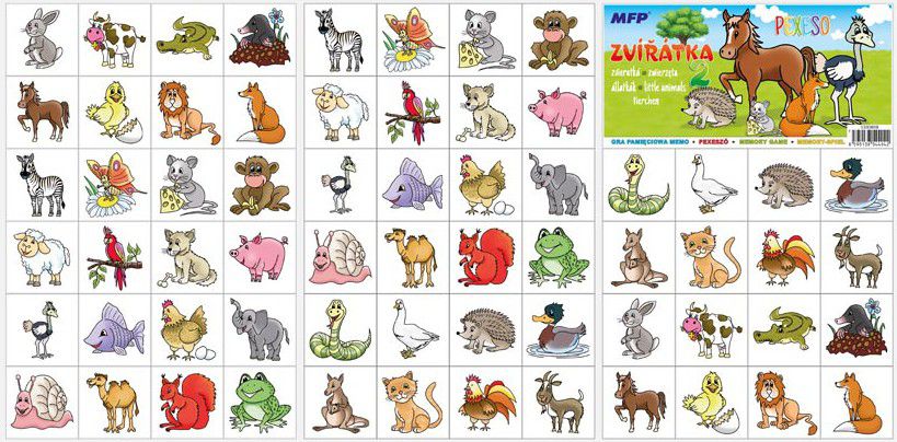 NÁVOD KE HŘE PEXESO: Pexeso mohou hrát nejméně dva hráči. Všechny rozstříhané kartičky zamíchají a rozloží obrázkem dolů do čtverce 8 x 8 kartiček. Nesmí se při tom dívat na obrázek. Hráči si určí pořadí hry. Hráč otočí dvě libovolné kartičky tak, aby si i ostatní spoluhráči mohli obrázky a jejich umístění zapamatovat. Pokud nemají kartičky stejné obrázky, otočí je a vrátí na původní místo. Pokračuje další hráč, který je na řadě. Jestliže objeví stejné obrázky, získává bod a obě kartičky vyřadí ze hry. Pokračuje do té chvíle, kdy otočí dva různé obrázky. Vyhrává hráč, který získá více bodů. PAPÍR: křída matná 350g + lamino lesk 1/1
