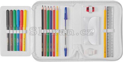 19 dílů - 6 fixů, 6 pastelek, tužka, ořezávátko, guma, kulič.tužka, 16 cm pravítko, kapsička, rozvrh hodin,